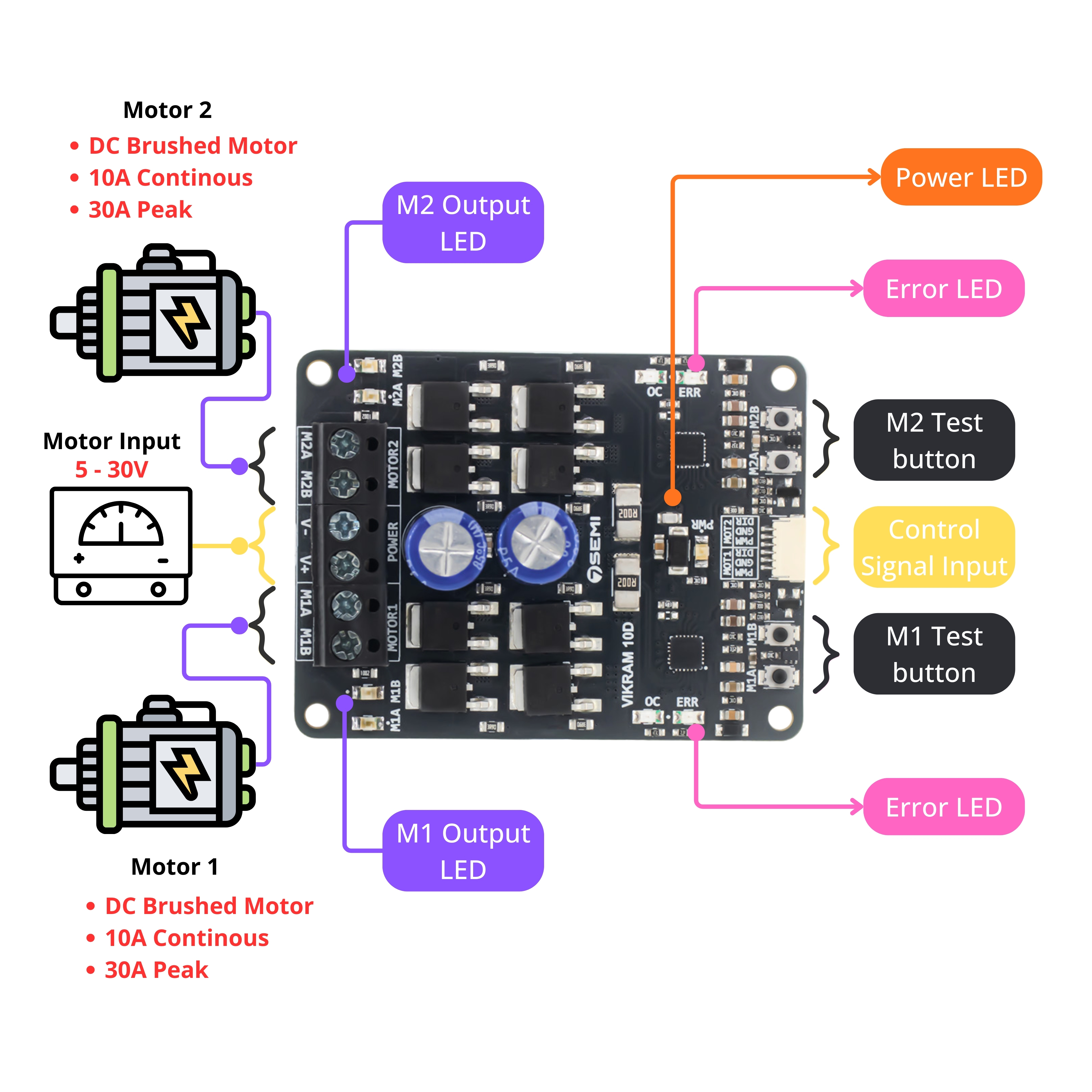 The 7Semi VIKRAM-3010D is a powerful dual-channel motor driver designed to control two high-power DC motors easily. It supports a wide input voltage range from 5.9V to 30V and can deliver up to 10A continuous current per channel, making it suitable for heavy-duty motors and high-load applications. The board allows full control of motor direction, speed, and braking, giving smooth and precise operation. It comes with strong connectors for secure wiring and built-in components to handle sudden current changes. With its solid design and safety features, this module is ideal for robotics, automation systems, and other applications where strong and reliable motor control is needed.