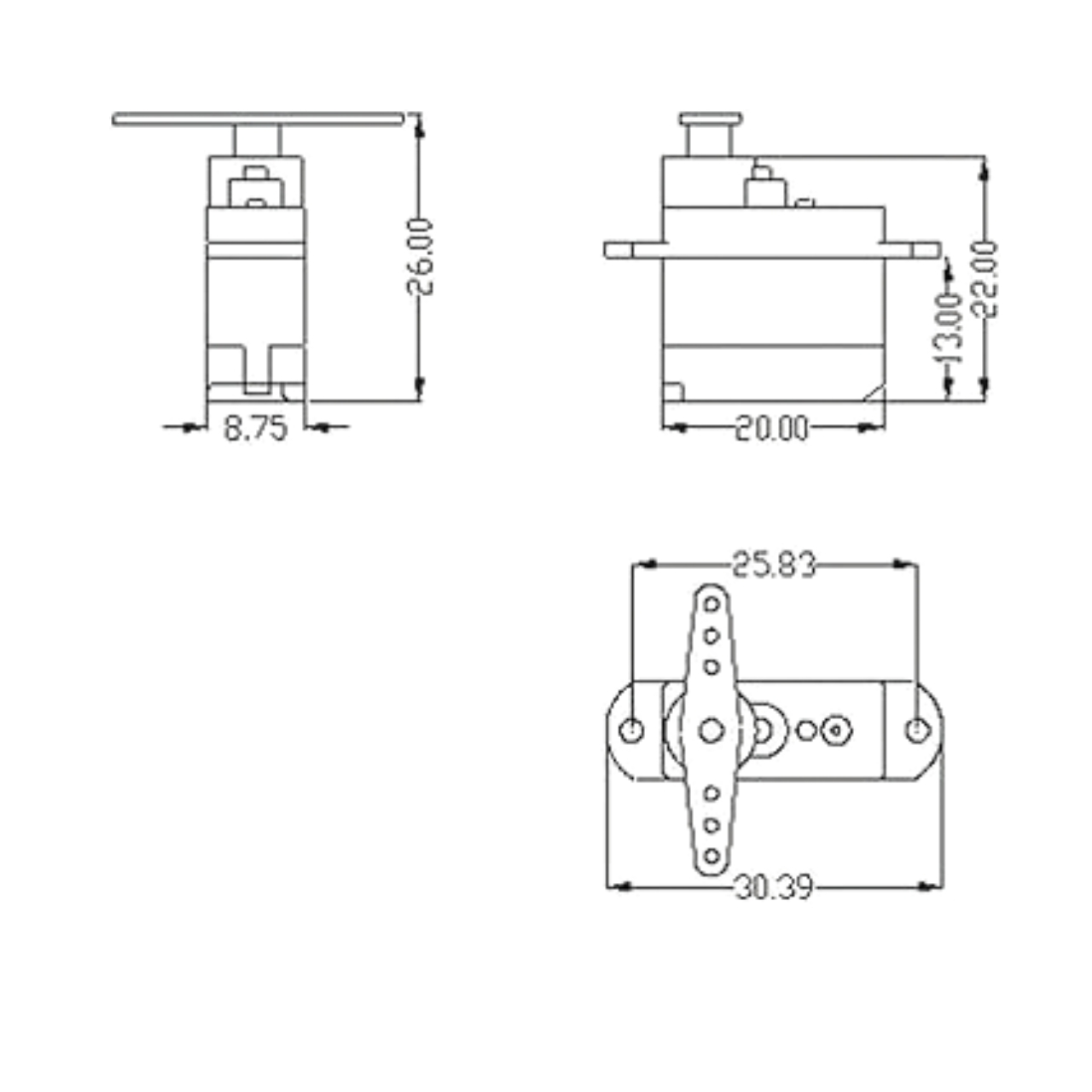 With a compact body size of 20 × 8.75 × 22 mm and a JR/Futaba-compatible 3-pin connector, this micro servo is ideal for projects where space and weight are critical.