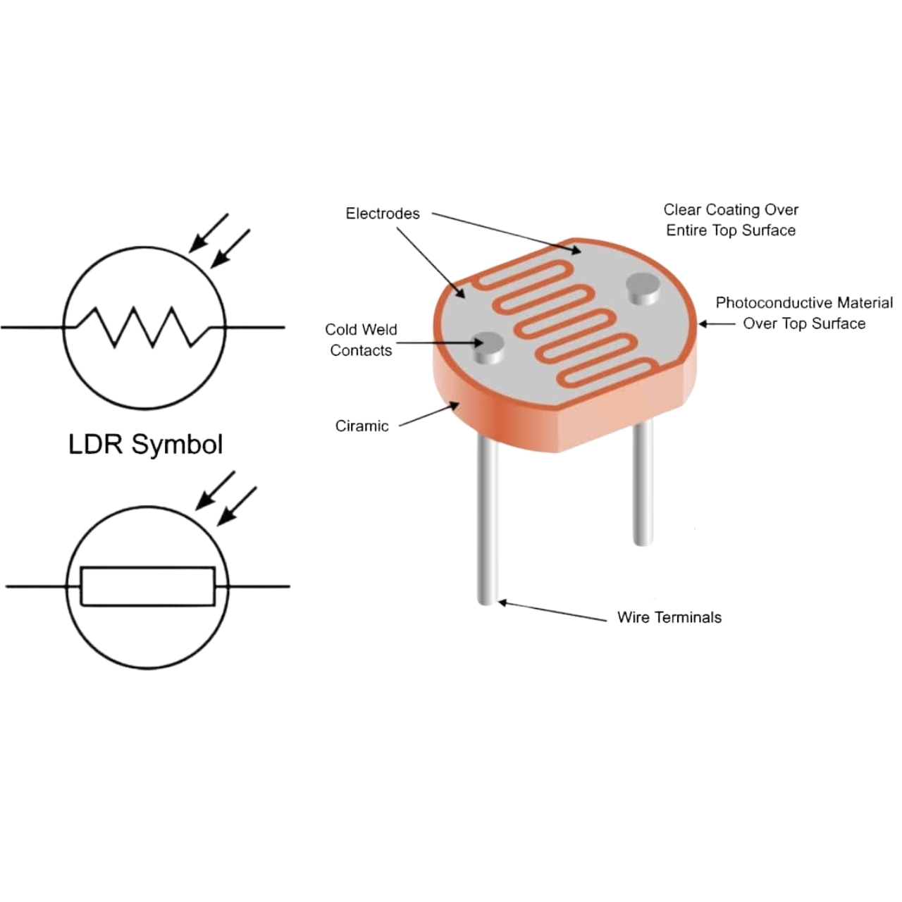 Light Dependent Resistors (LDRs), also known as photoresistors, change their resistance depending on the intensity of light falling on them. When light levels increase, resistance decreases; in darkness, resistance increases significantly.