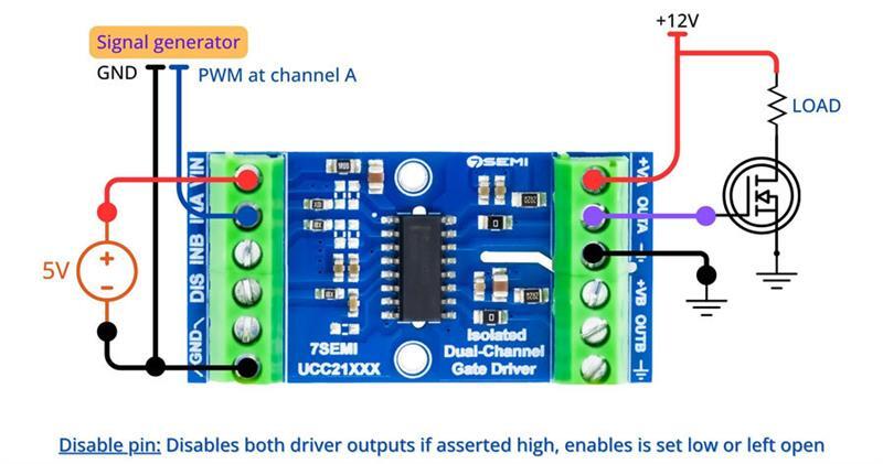 The 7Semi UCC21220A Dual-Channel Isolated Gate Driver Breakout is designed to drive power transistors such as MOSFETs and GaNFETs, delivering a peak source current of 4A and a peak sink current of 6A. It features a 3.0kVRMS isolation barrier between the input and output channels, ensuring robust operation in high-voltage environments. The module offers fast switching performance with a maximum propagation delay of 40ns and a delay matching of 5ns, enhancing efficiency in power conversion applications. Integrated protection features include undervoltage lockout (UVLO) and a disable function, which enhance system reliability by safeguarding against undervoltage conditions and allowing for immediate shutdown when necessary. This breakout board is suitable for applications requiring efficient and reliable gate driving capabilities, including motor drives, power converters, and industrial automation systems.